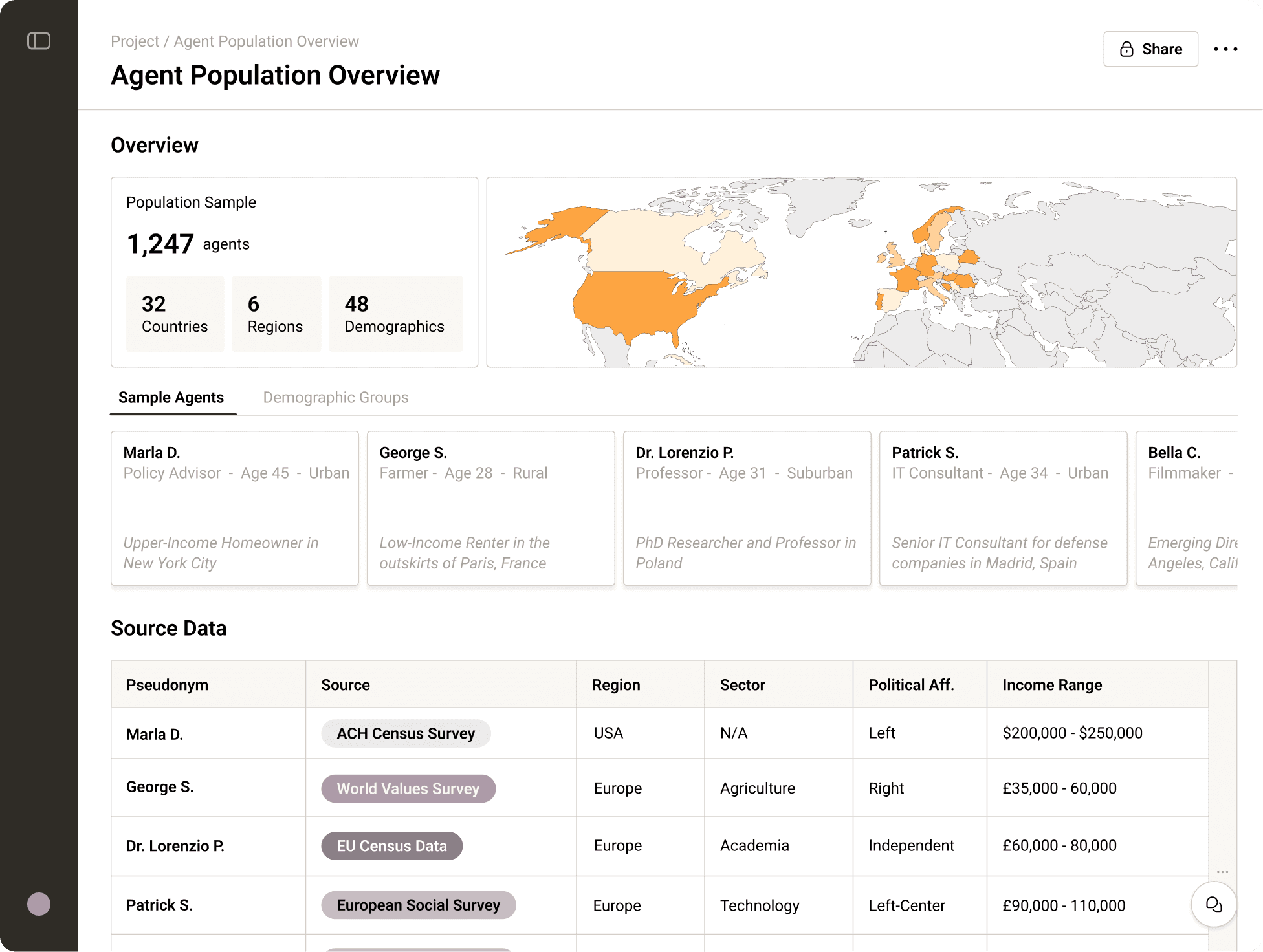 For organization-specific use cases, we can integrate a customer’s own survey data to build more tailored agent profiles and scenario analysis.